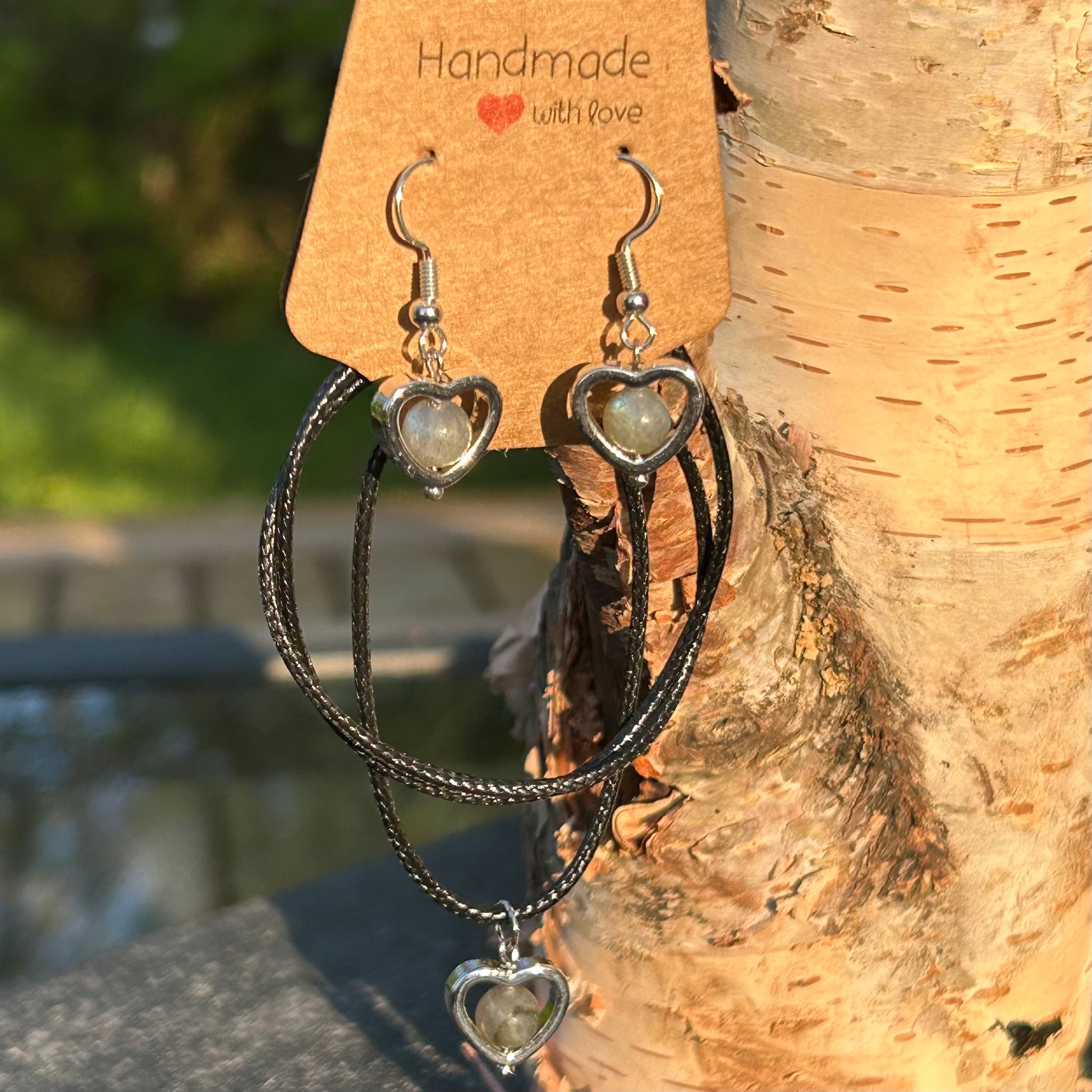 Choose either labradorite or rose quartz for this sweetheart earring and necklace set