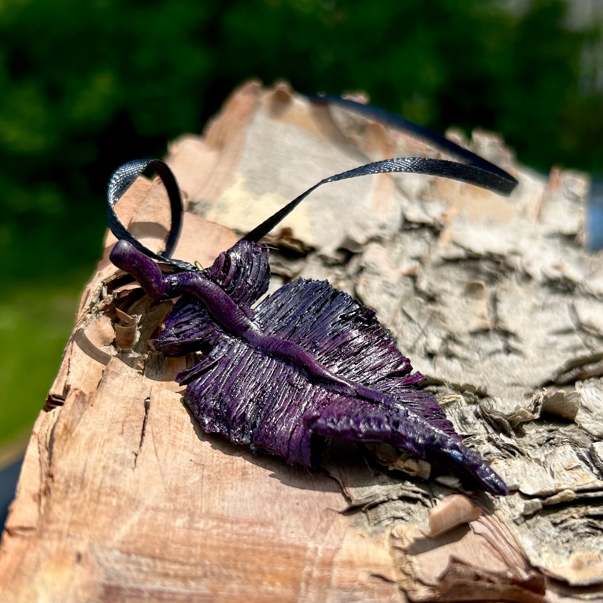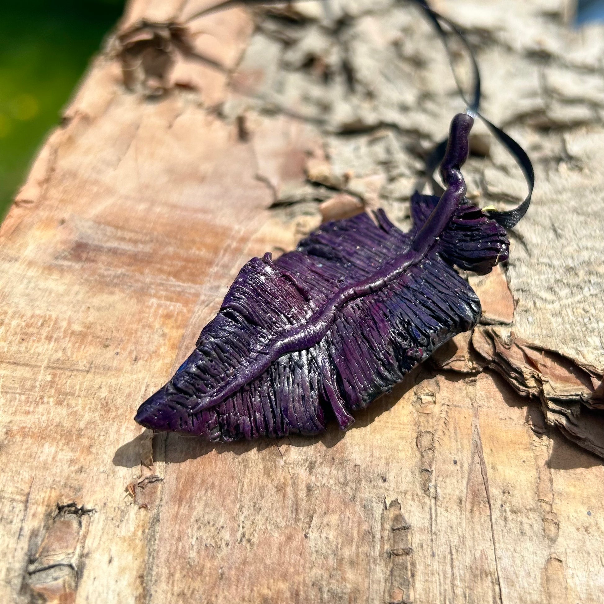 This raven-inspired pendant is crafted from polymer clay and features a range of colours achieved through paints and ink.