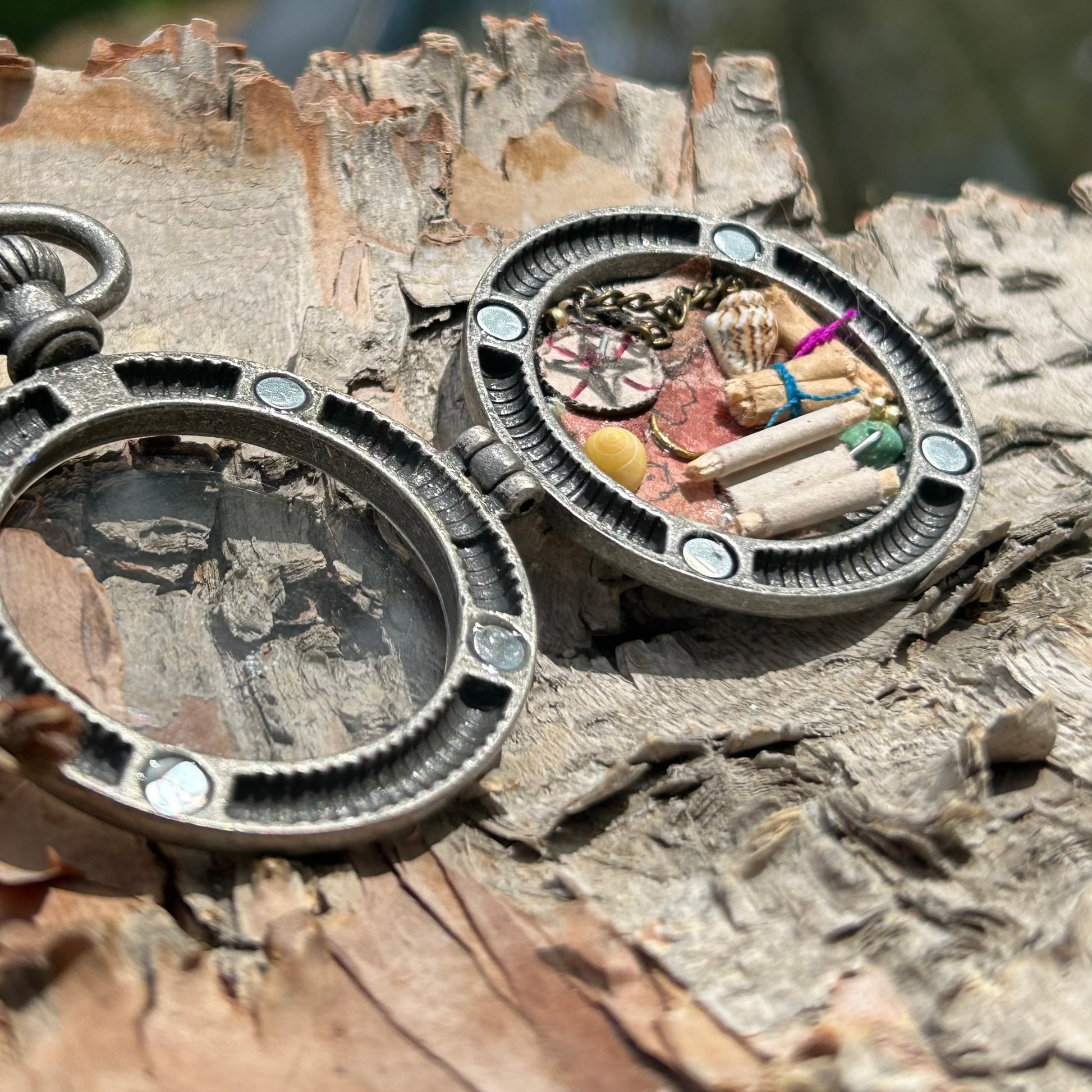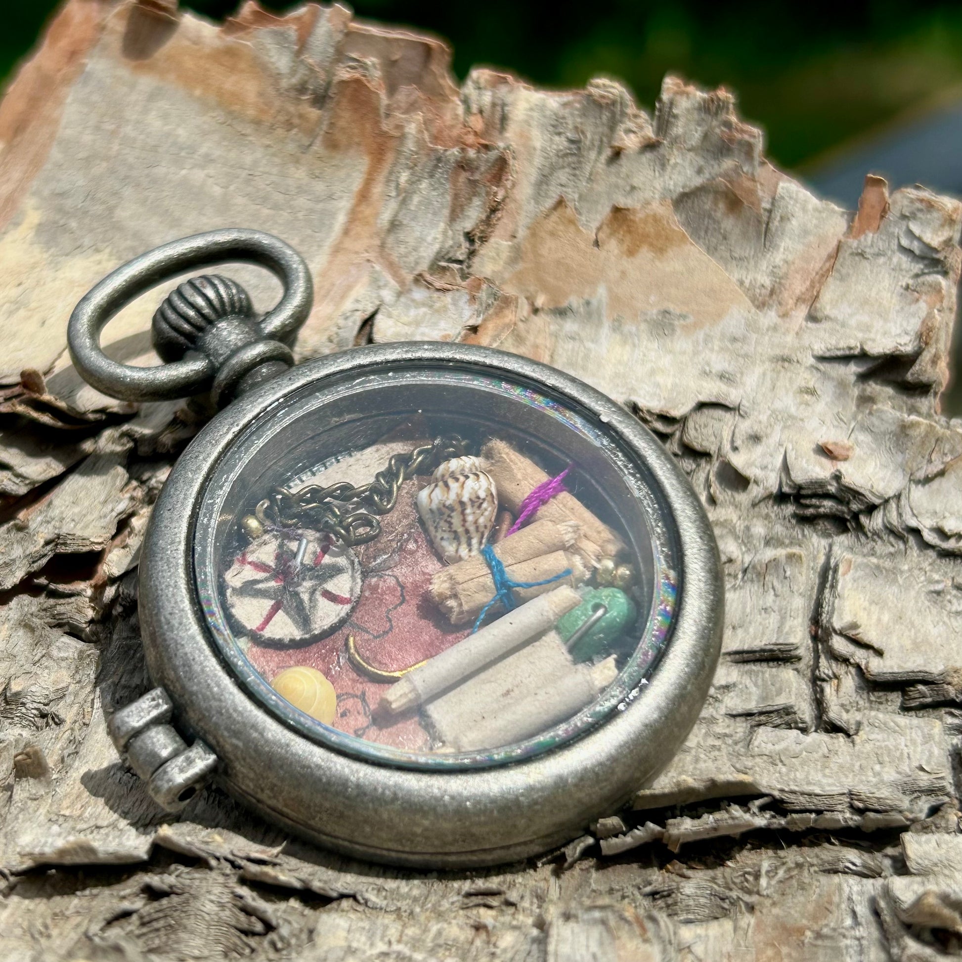 This pocket watch case contains a miniature scene inspired by nautical travel and pirates. It includes a handmade miniature scroll, compass and map, as well as small gems, shells and metal pieces to mimic treasure.