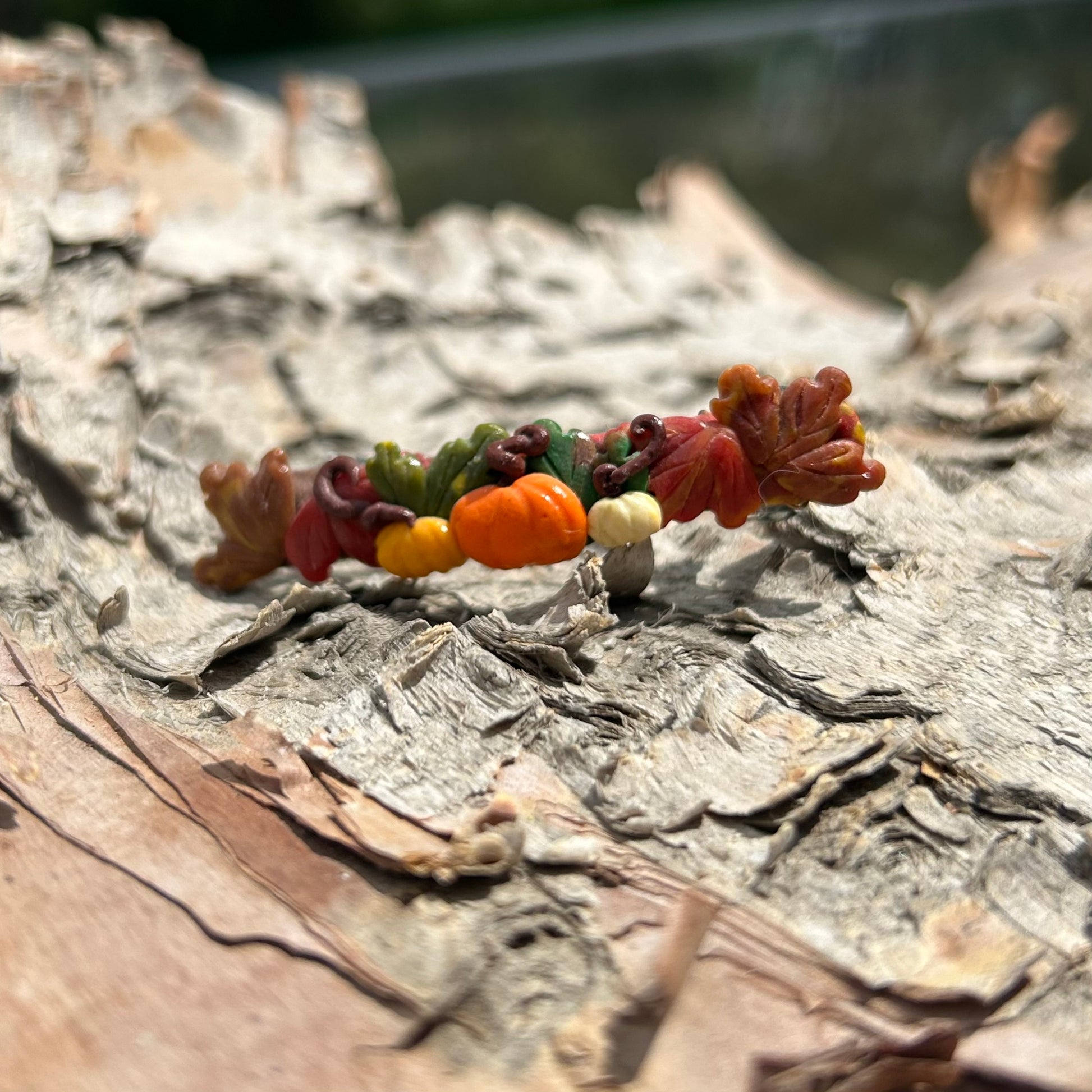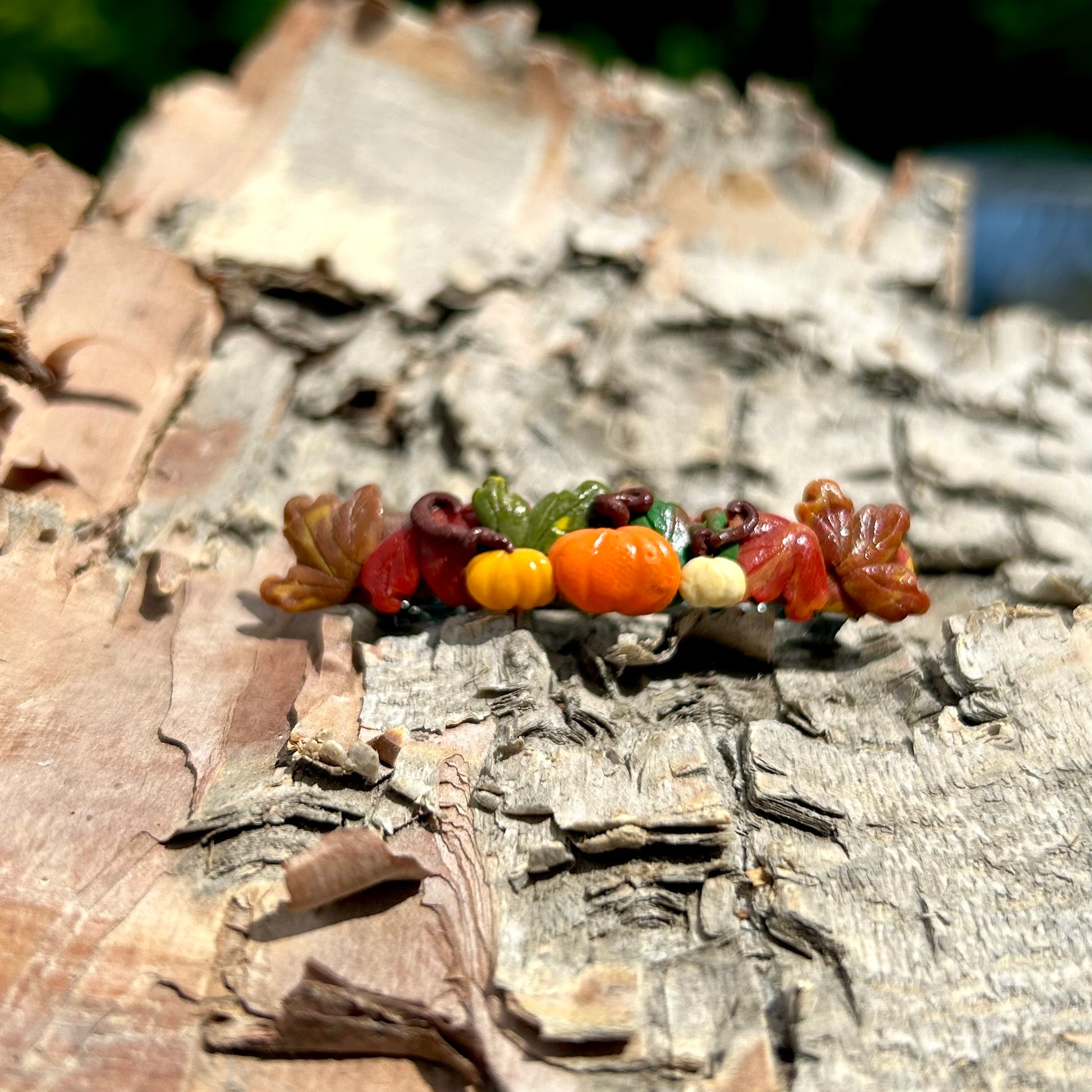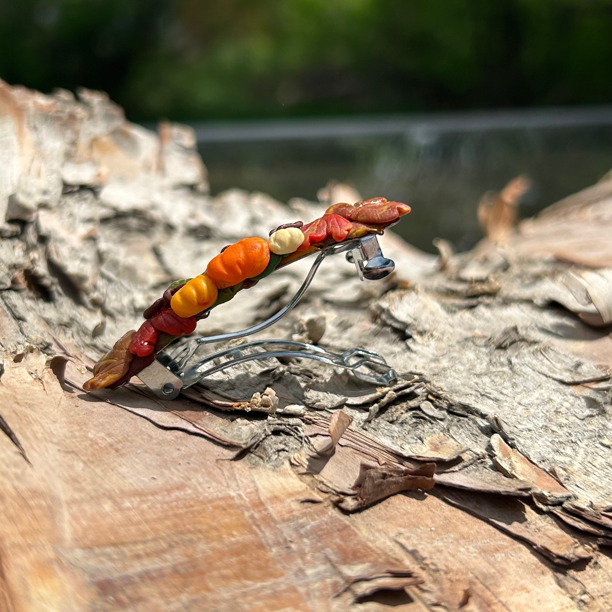 This barrette features pumpkins and autumn leaves sculpted from polymer clay.
