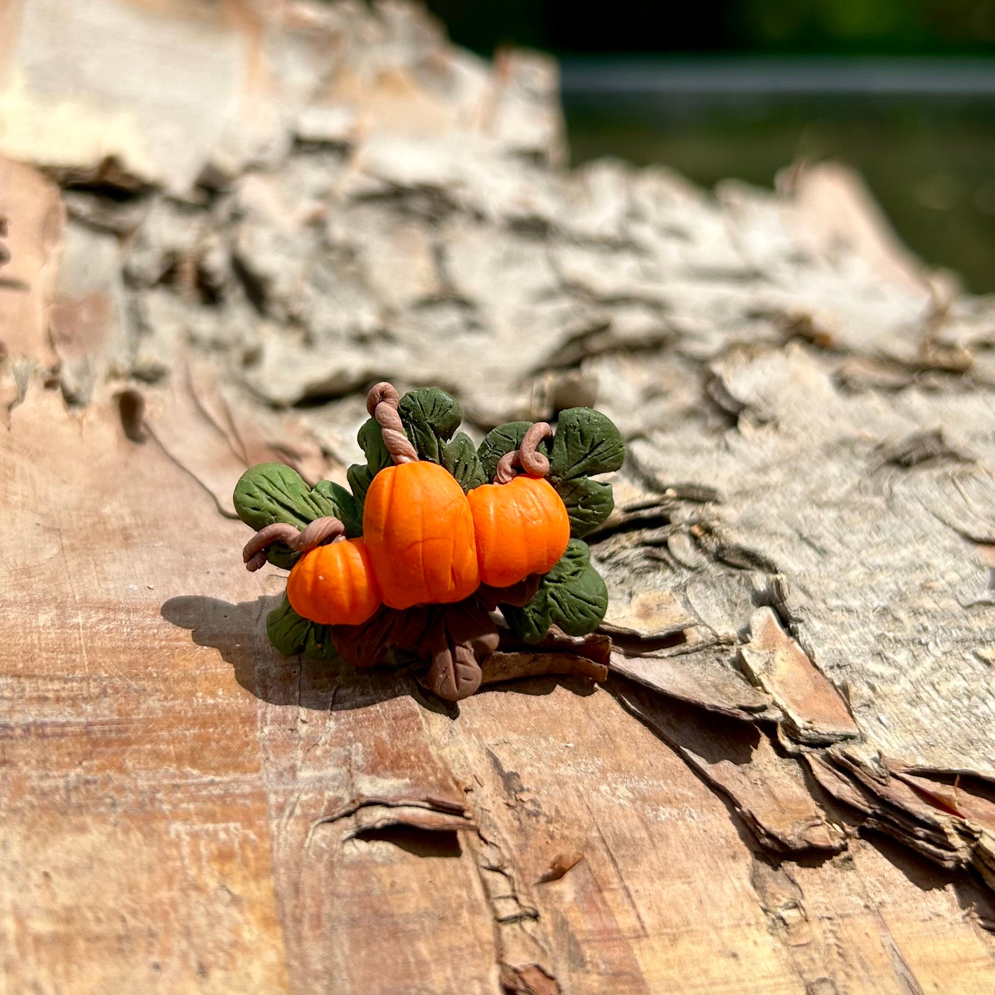 This pin features pumpkins and leaves sculpted from polymer clay. The backing has a locking closure to keep it extra secure.