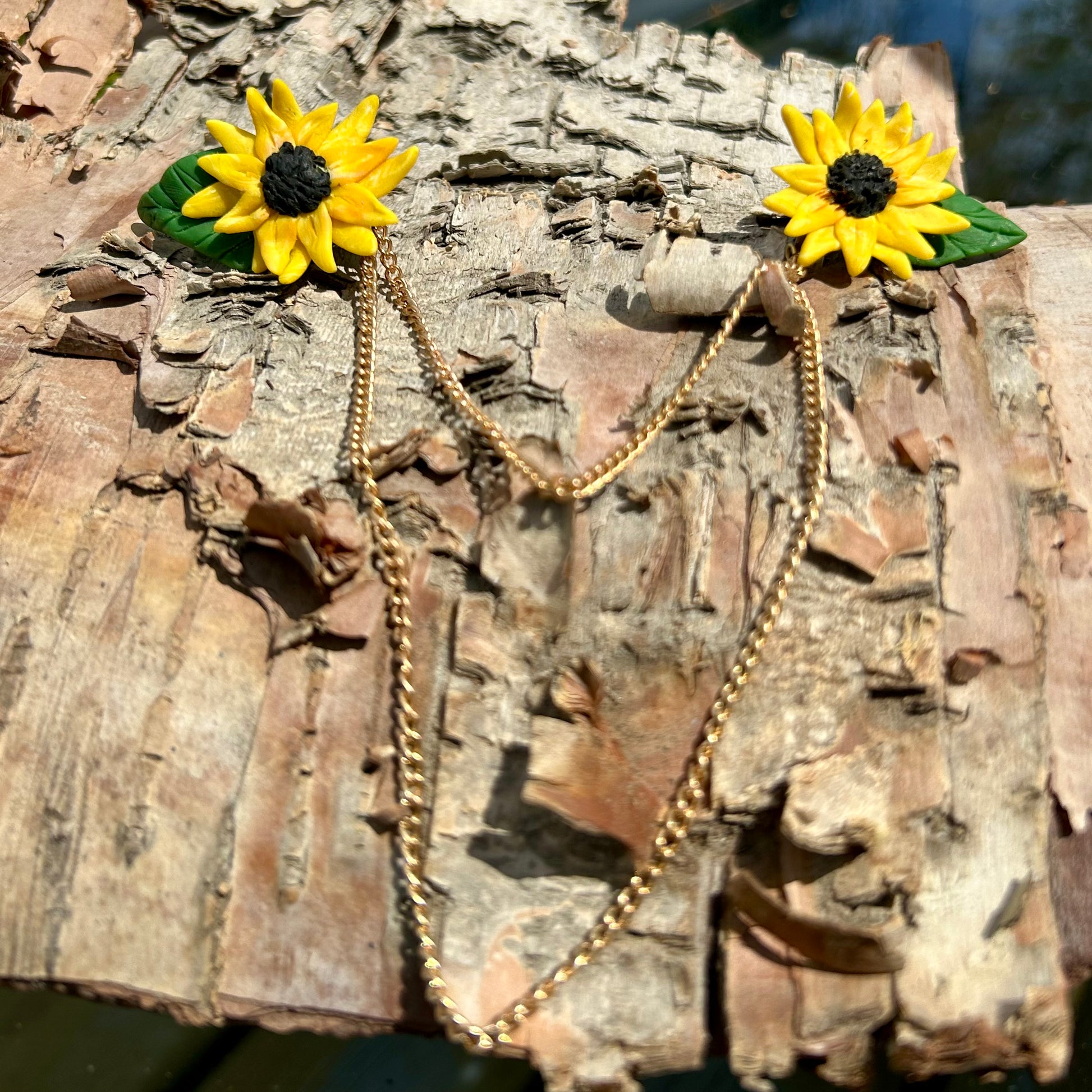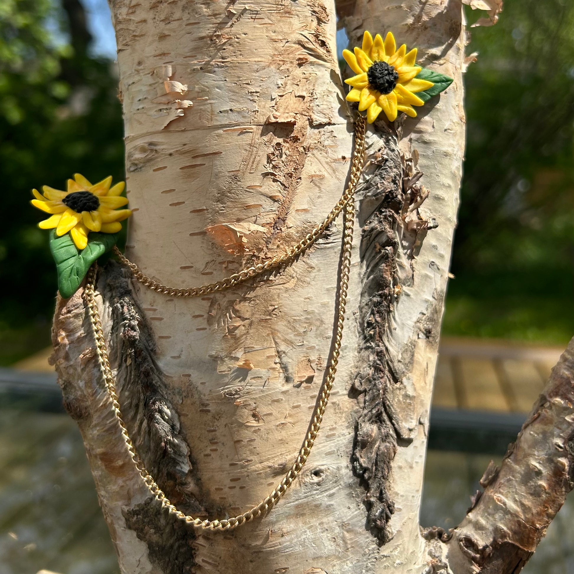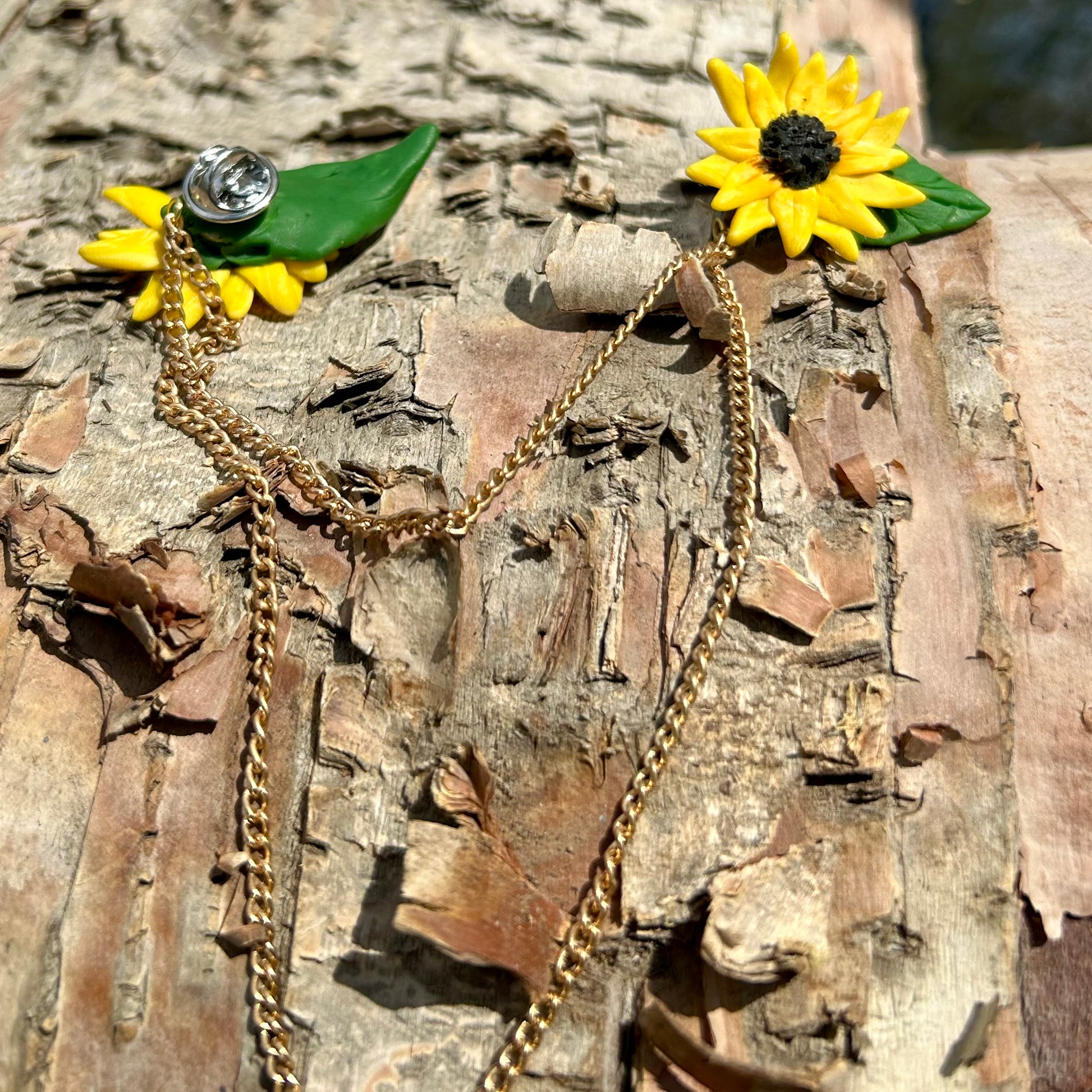 This double brooch is perfect for shirt collars, cloaks, and lapels. Featuring sunflowers sculpted from polymer clay, it gives a pop of summer or autumn colour to any outfit.